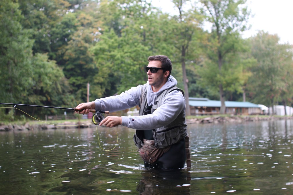 We walked down to the river and just watched for a moment. Most of the guys their were just using center pins or spinning tackle and just drifting STRIKE INDICATORS (not to be confused with bobbers, because its fly fishing so it’s a STRIKE INDICATOR) with worms in the slack water. That’s not our favorite style of fishing so we hightailed it up river to the faster moving waters. Luckily for us we had my favorite section of river all to ourselves. There were a few smaller fish jumping occasionally, enough to keep us hopeful. However, we did see three monster northern pike just chillin in the slack water. They kept us entertained for about thirty minutes from our main objective since neither of us have ever caught a pike on a fly. We each got one swipe from the same fish but another angler spooked them away. This older gentleman that showed up next to us was a character. He was a nice guy and made good conversation since it was a slow bite, but he was giving the usual fisherman stories. According to this gentlemen we should have been their ten years ago, the brown trout fishing at this particular spot isn’t good (which I caught a world class brown their the year before but I won’t argue), the Russians are taking all the fish, the Buffalo Bills are actually doing good this season (GO BILLS), people from Ohio need to stop snagging fish, and did I mention that ten years ago he had double digit days every, single, day. Like I said though this guy was a character and made the morning a little more entertaining.