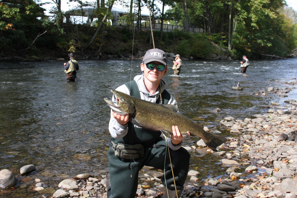 Now this is where my least favorite aspect of salmon fishing these rivers comes into play. I’m hooked up to a decent fish and its general common courtesy to get out of someone’s way whos fighting a fish. This guy who is barley in the water gets my line wrapped around his feet and then proceeds to rip my line over his head instead of taking a couple of steps back. Of course I didn’t say anything but it’s those type of people that get me so mad. Like what if it was my buddy who was hooked up to his first salmon and because of that guys inconsideration and laziness that he lost his first fish. Thankfully the fish didn’t come off and I was able to land it after about a good couple of minute fight. I got it to shore got a couple of pictures and let it go. We fished the rest of the day with no other success went home had some beers and got ready to do the same thing over again the next day.