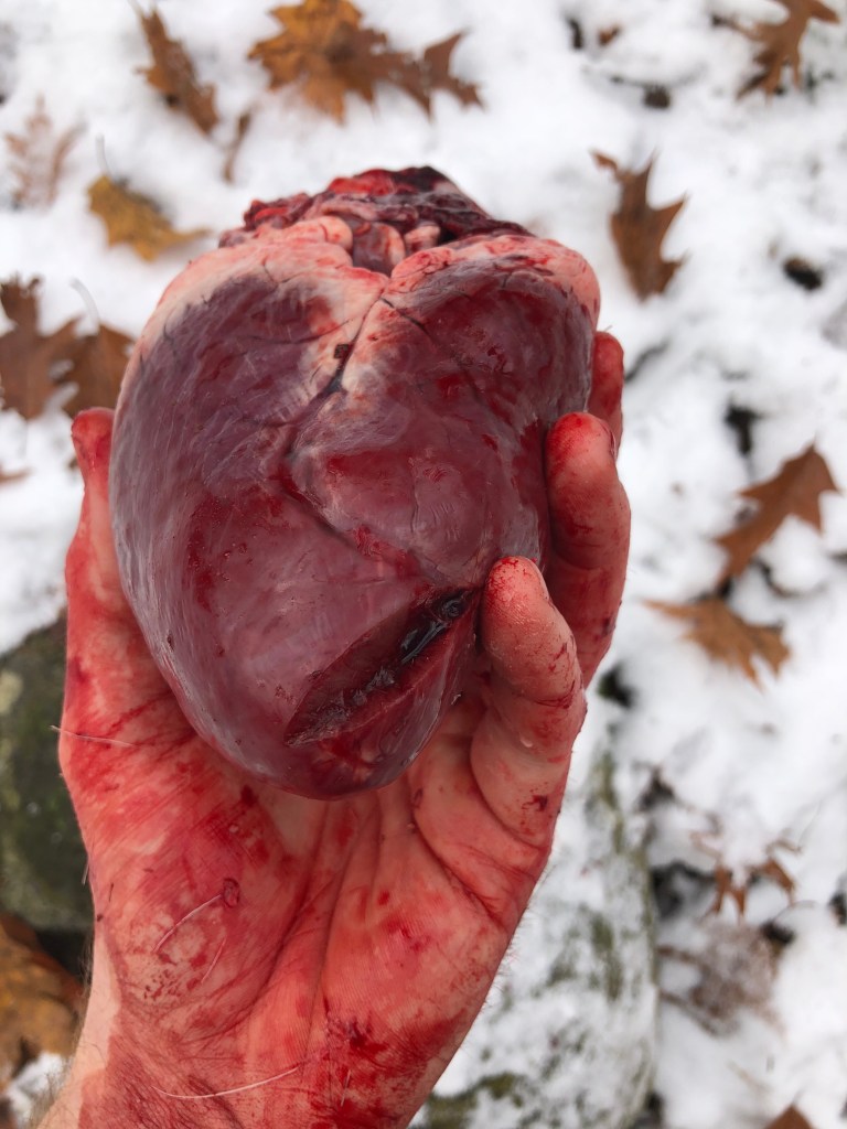 Now it was time for the real work to start. I got to gutting the deer all by myself. I dragged it ten yards down hill and tied the front and back legs to a tree. That way it would be easier to work with. When I got the deer all opened up it was easy to see that I made a great shot on this buck. I essentially sliced his liver in half, hit his lungs, and put a nice nick in his heart. I was excited to save the heart from this buck because I wasn’t able to from my last doe. This gutting experience compared to the last doe I harvested was much better. It went by much quicker and from the time I started to the time I ended my good friend Andy was already pulled up at the spot waiting to help get the big ol’ buck home.