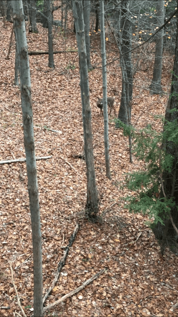 The next morning I got up thirty minutes earlier than the previous day at 4:30 am. I was in the car and at my spot by 5:00 am. Getting up earlier was definitely worth it. I saw no deer on my way in and as I climbed into my stand I hadn’t even put my safety harness on and there was a buck grunting and chasing a doe behind me. The dow ran downhill and the buck ran back uphill. Sunrise came around at 6:53 am and I saw some deer running around up the hill from me. They were too far to determine what they were. Five minutes goes by and that tiny doe from the day before ran up the ridge behind me. Right away I knew why. A decent size six pointer was right on her trail. Nose glued to the ground. He was thirty yards from me with no shot. I watched him move out of sight, I slowly turn my head to look down hill and see a decent sized doe walking up the hill towards me. In my head im jacked up because I have one more doe tag and I am literally starving for meat in my freezer. Then I realized there was an even bigger doe behind her. My adrenaline is going and I’m starting to get the shakes pretty good. They are both b-linen it right for me.